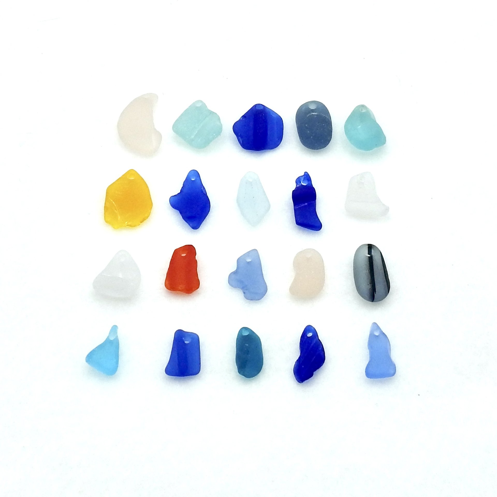 A unique mix of real sea glass charms, set of 20, with top drilled holes for jewelry making or other beach themed crafts.