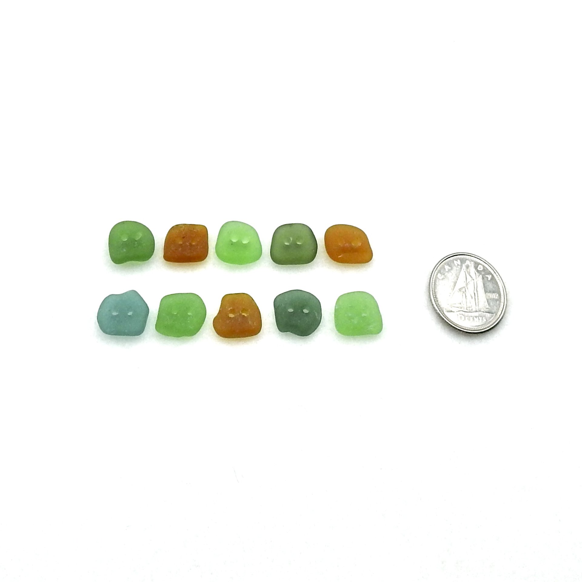 Genuine sea glass buttons, set of 10, with two drilled holes for sewing, decoration or other beach themed crafts.