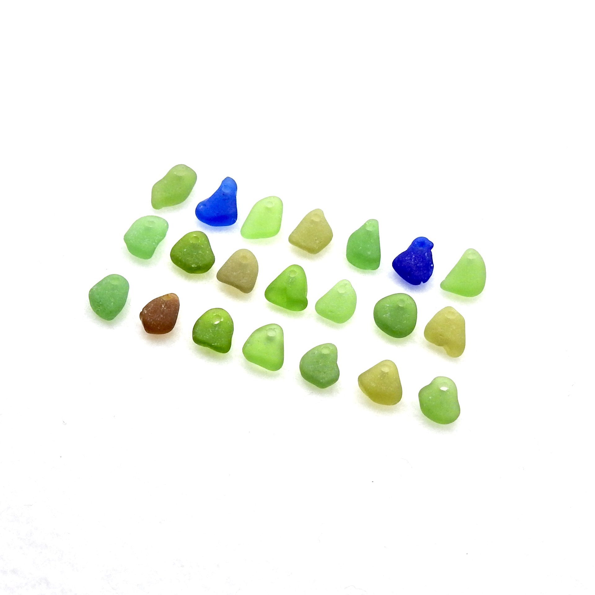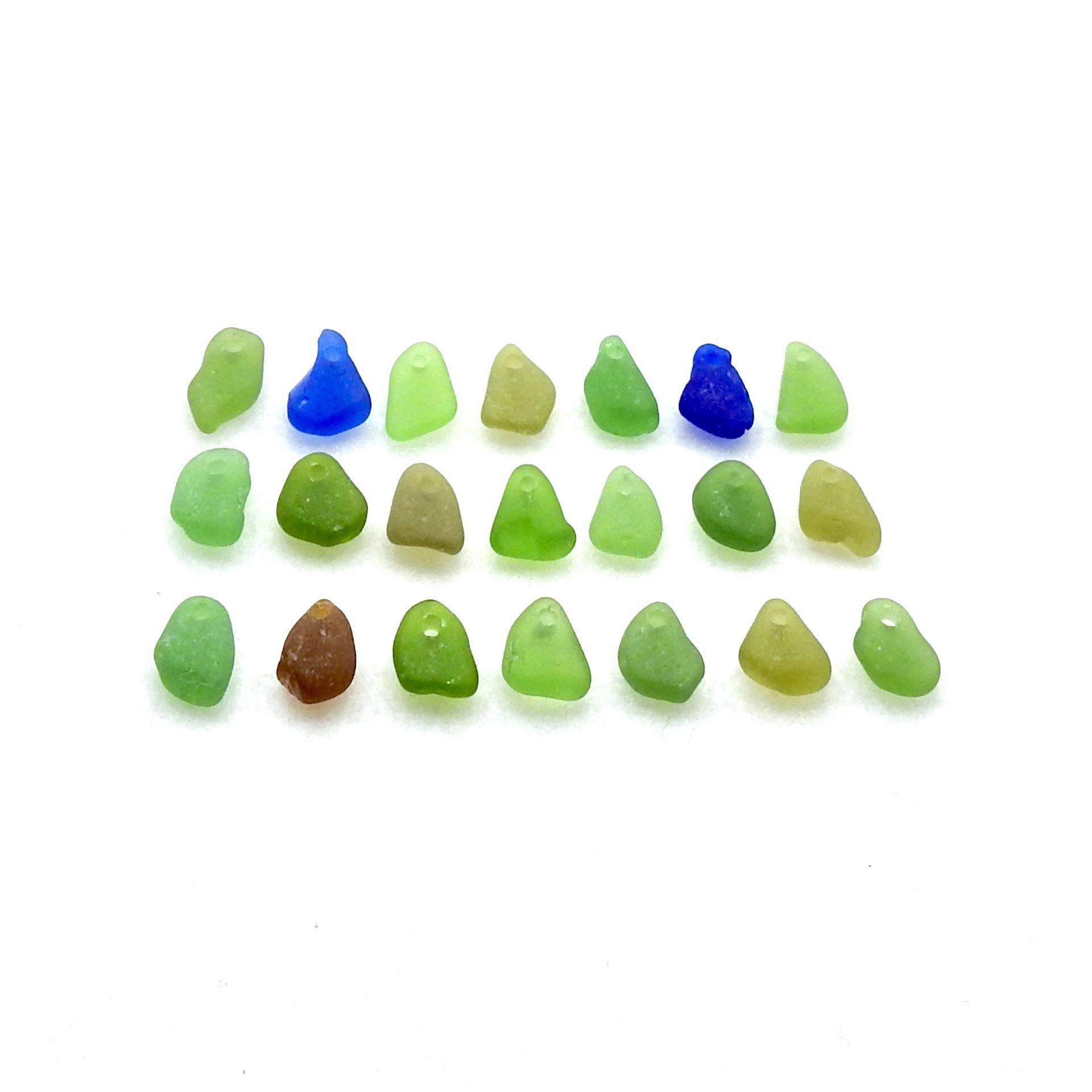 Tiny genuine sea glass charms, set of 21 in assorted colors, with top drilled holes for jewelry making, sew on or other beach themed crafts.