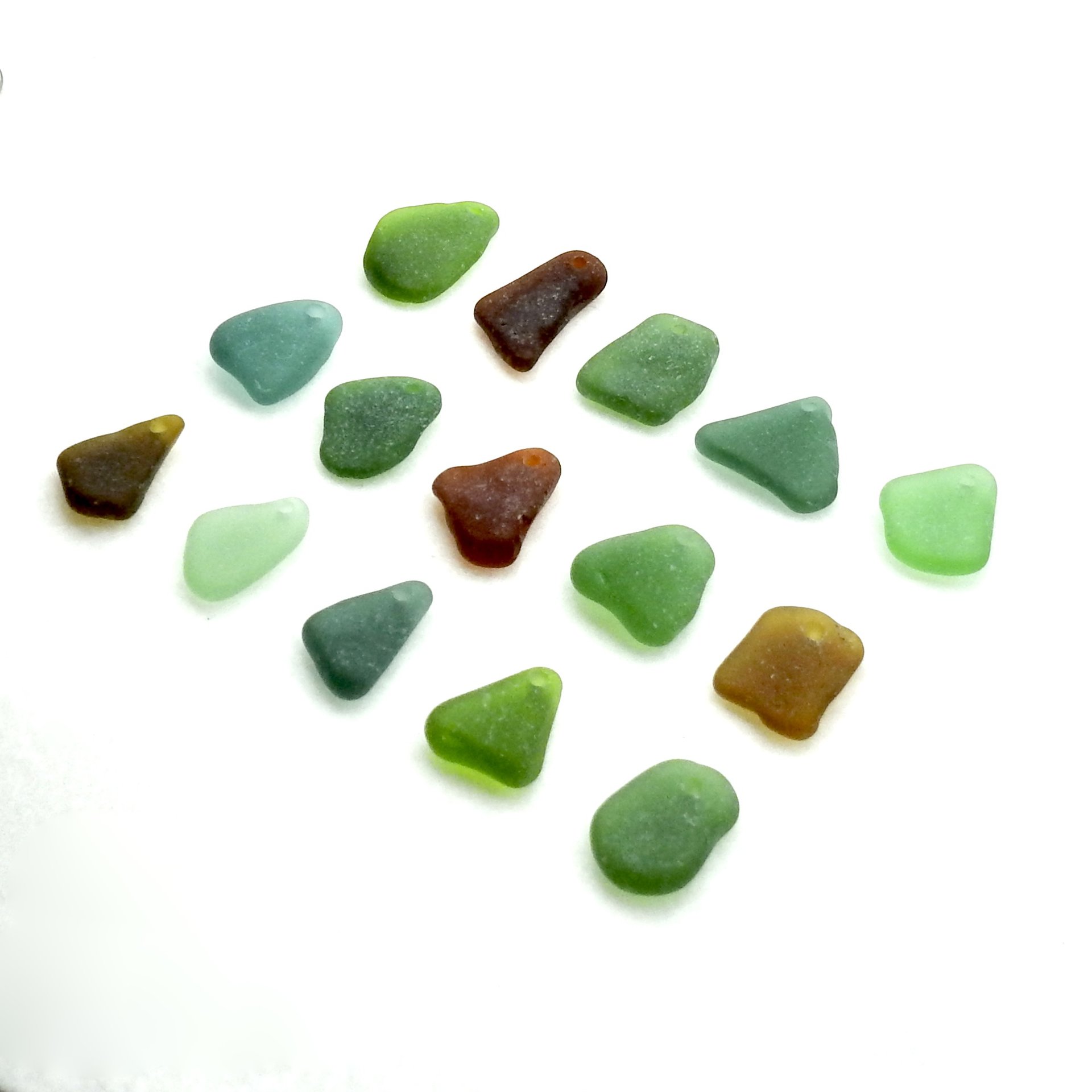 Genuine sea glass charms, set of 15, in mixed colors with top drilled holes for jewelry making or other beach themed crafts.