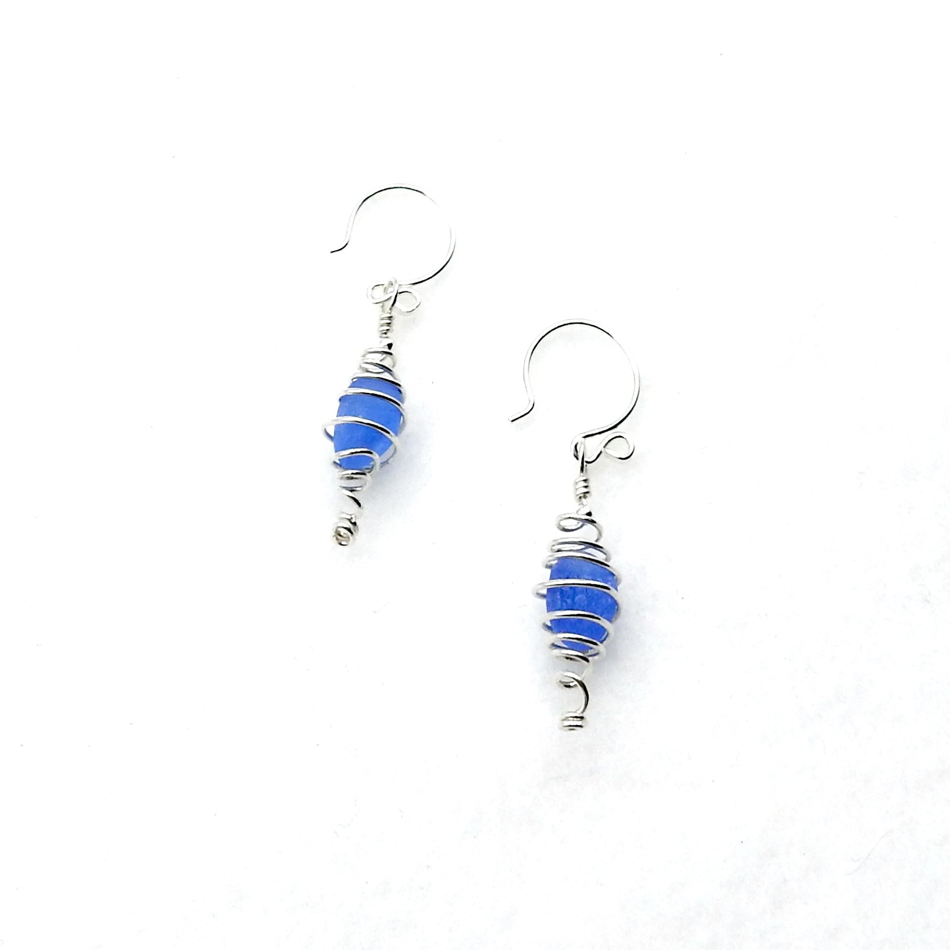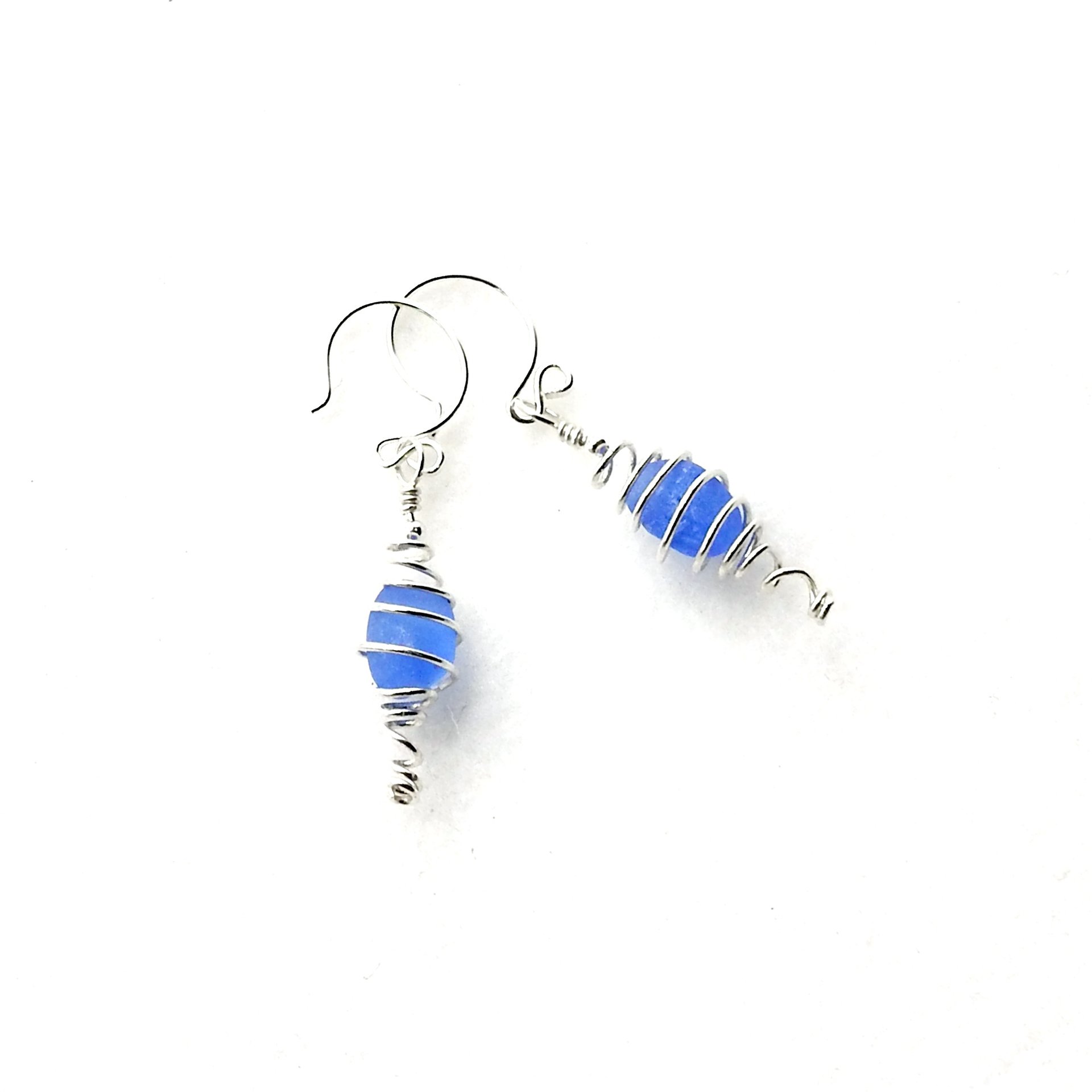 Sterling silver spiral cage pierced earrings, handmade with cornflower blue genuine sea glass pieces.