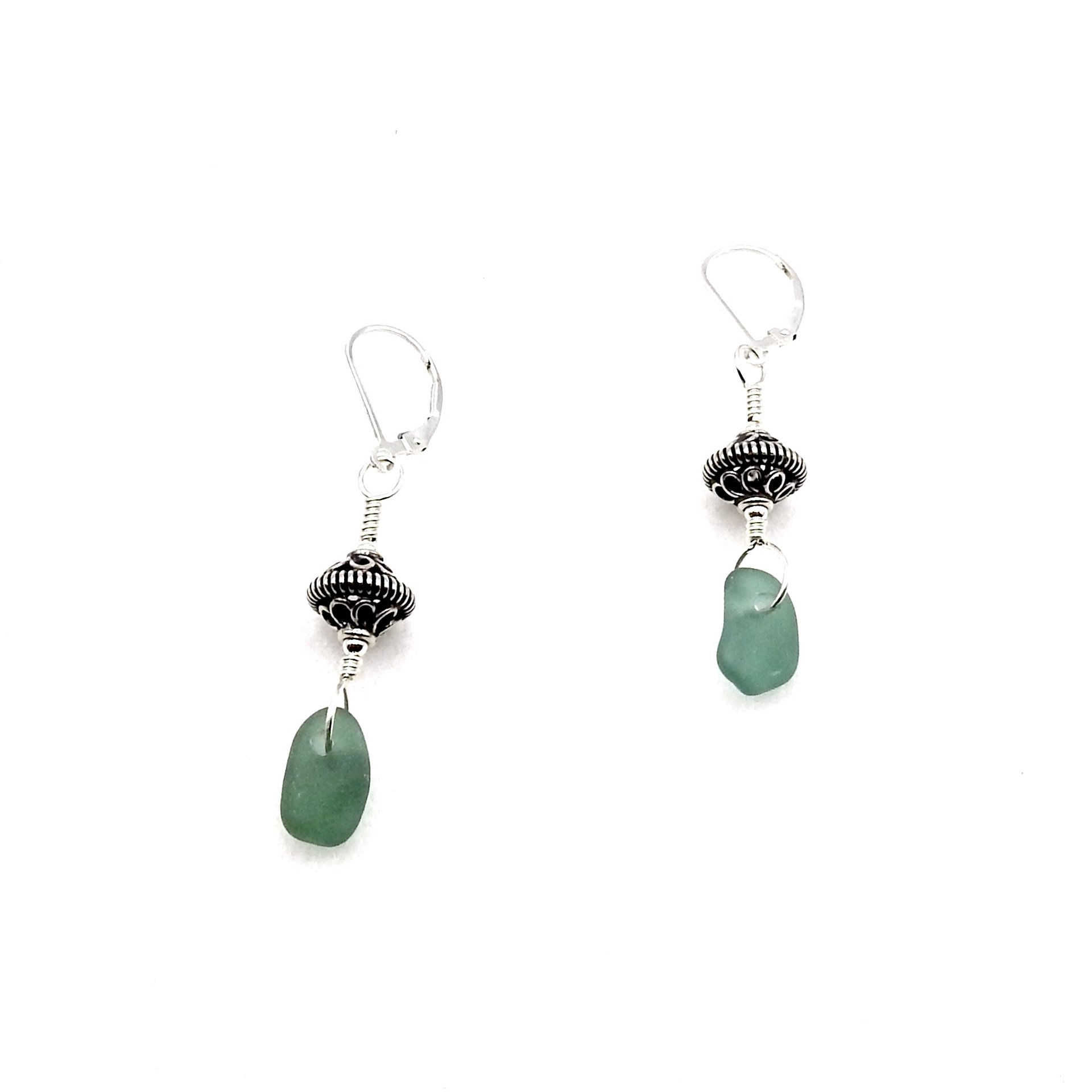 Handmade earrings with very tiny teal green genuine sea glass drops and sterling silver Bali beads with lever back pierced ear wires.