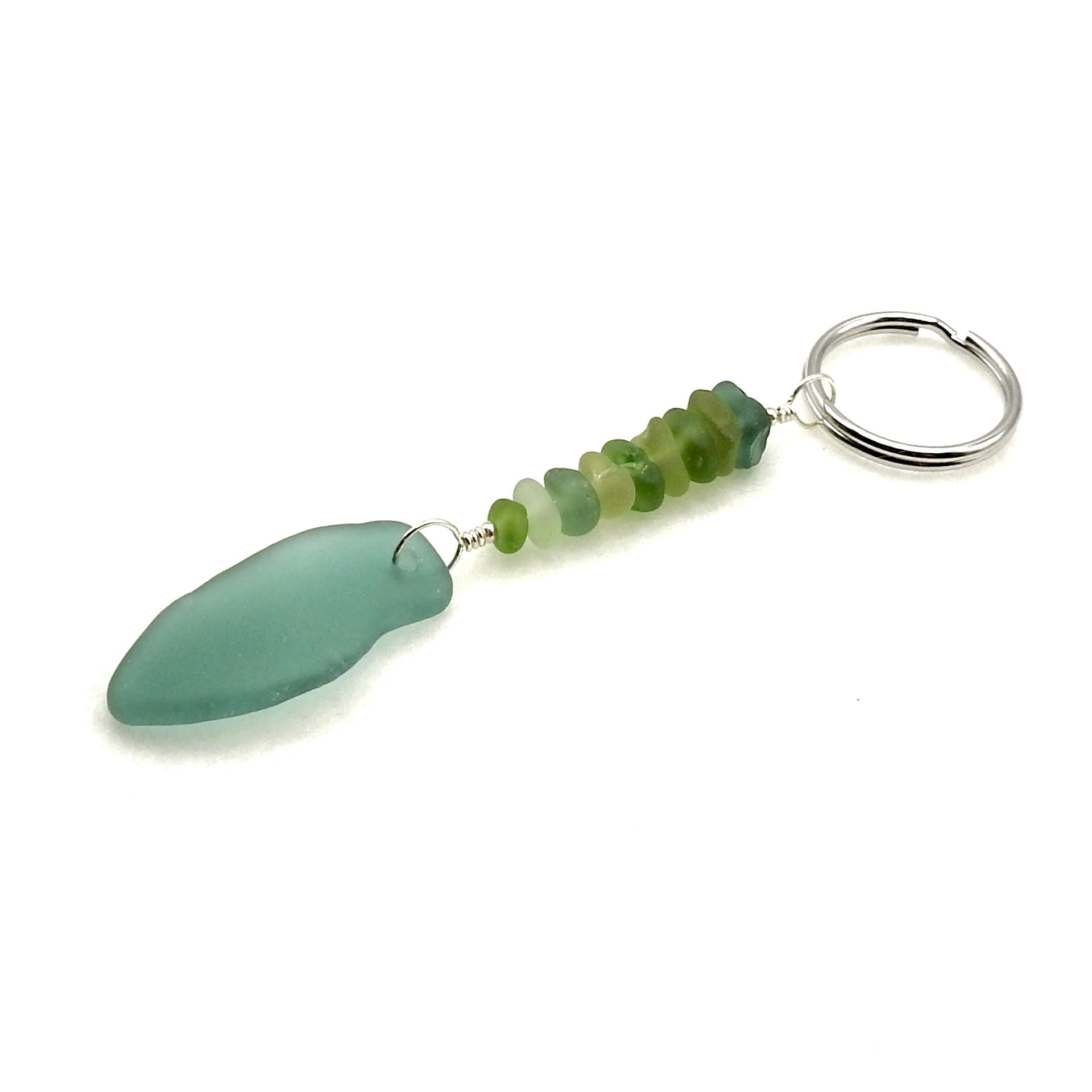 A beach themed keychain, handmade with tiny genuine sea glass pieces in mixed colors with a teal green pendant.