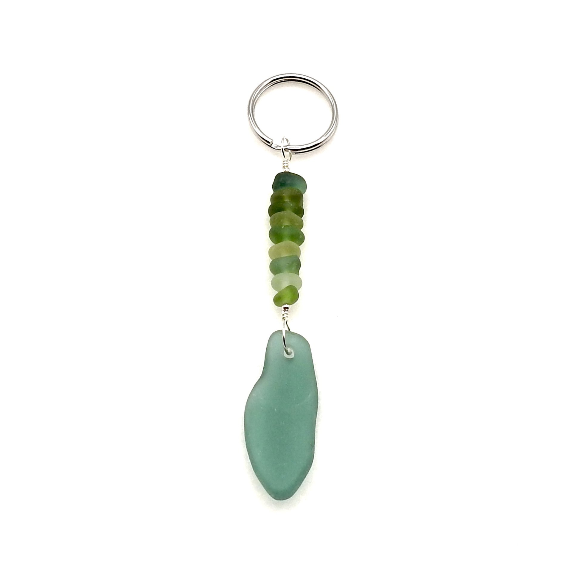 - materials - genuine sea glass pendant (1 1/4" - 3.2cm) in length, tiny sea glass, sterling silver wire and tiny round beads and a silver tone keyring