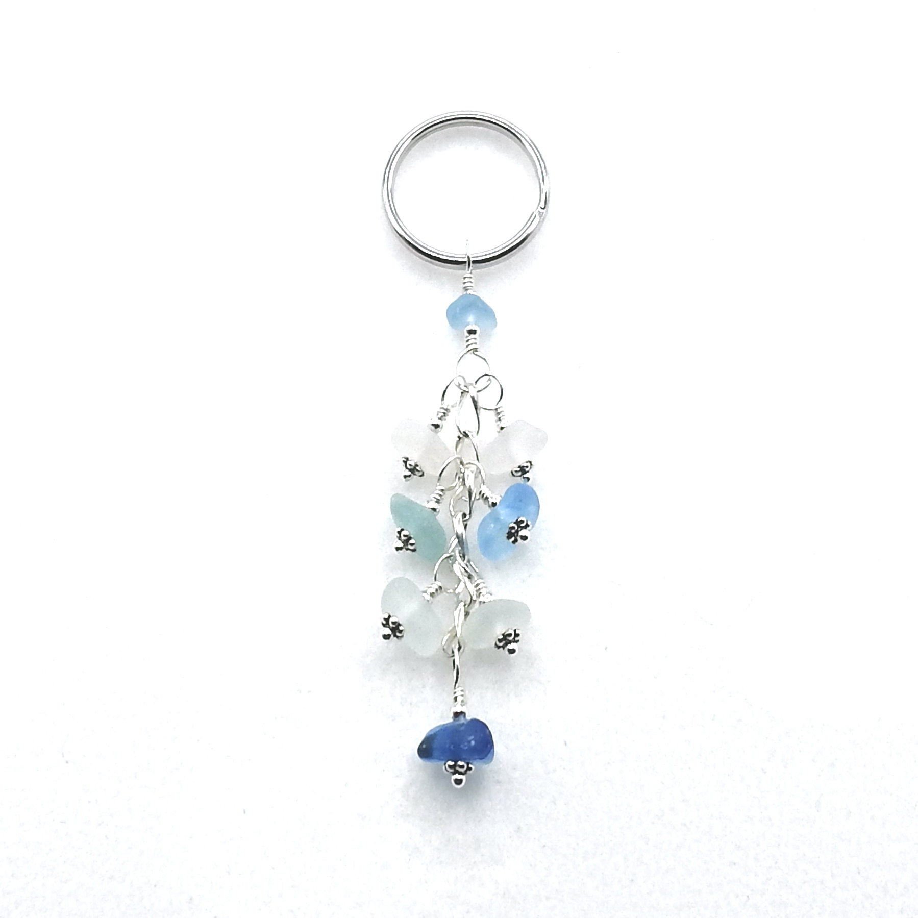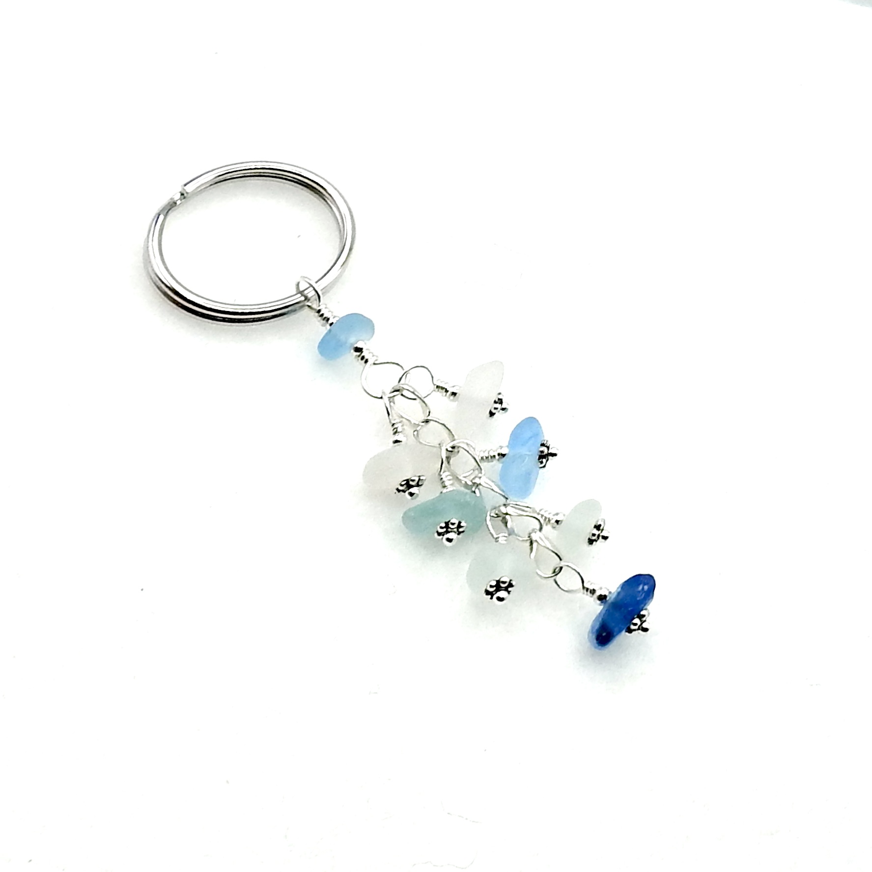 A dangly keychain, handmade with genuine sea glass pieces in shades of white and blue.